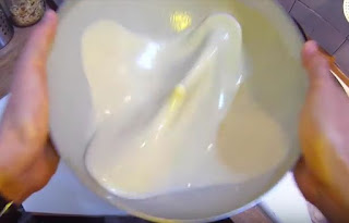 2. 1で残った卵の白身を泡立て、そこに小麦粉を入れ、よく混ぜる。
